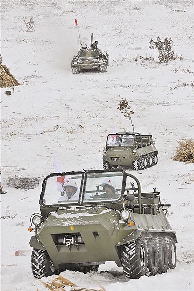 此刻,记者的身后扬起的是一片飞雪。记者曾乘坐过多种军用车辆,但像全地形突击车这样小巧但威猛的却不多。嘶吼的马达声,透露着舍我其谁的豪情。