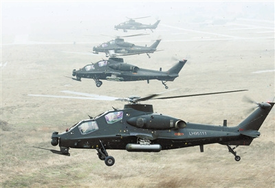 某陆航旅直-10武装直升机编队雾天超低空飞行。 特约记者 郭维虎摄