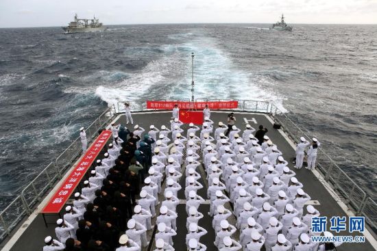 2月22日,在导弹驱逐舰哈尔滨舰上举行的“再见祖国·建功大洋”宣誓仪式上,中国海军第十四批护航编队的官兵们面对国旗进行宣誓。经过7天6夜的航行,2月22日8时,中国海军第十四批护航编队穿越祖国领海线,正式告别祖国,奔赴亚丁湾接替第十三批护航编队执行护航任务。(新华社记者饶饶摄)