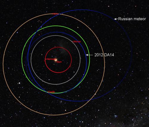 在陨石袭击俄罗斯当天晚些时候,一颗编号为“2012 DA14”的小行星在17200英里的上空与地球擦肩而过。从上图二者的飞行轨道来看,没有什么必然联系。