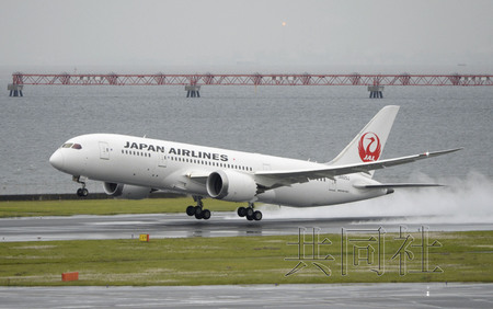5月2日早晨,日航试飞的波音787客机从羽田机场起飞。(共同社)