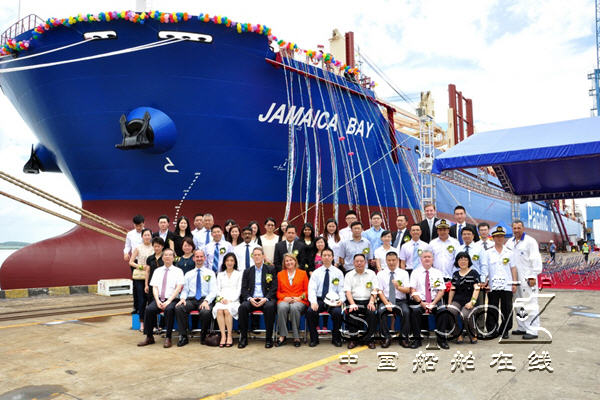 当天上午十二时许,我司在三号码头为其举行了隆重的命名仪式,教母Mary Gadams女士在八十多位嘉宾参加的命名仪式上宣布“我将此船命名为JAMIACA BAY号,愿上帝保佑她以及随其航行者”,此后教母砍断缆绳,按照航海传统在船舷打碎了一瓶香槟酒,紧接着鞭炮声起,汽笛长鸣,礼花齐放,气球漫天飞舞,在场人群欢呼声不断,以此庆祝此艘散货船的命名。
