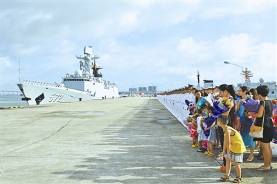 南海舰队司令员蒋伟烈、政委王登平,外交部、交通运输部、地方工业部门有关领导和部分官兵亲属到码头送行。