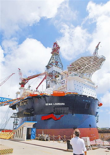 当日,由中远船务设计承建的圆筒型超深水海洋钻探平台“希望3号”被正式命名为“SEVAN LOUISIANA”。该平台将用于墨西哥湾的深海油田开釆作业。“希望3号”是中远船务建造的希望号系列海工平台的第三座,平台总高135米,钻井深度12000米。(新华社发 -解放军报)
