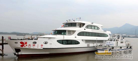 近日,广东江龙船舶有限公司为三亚某旅游发展有限公司制造的300客位豪华观光船––“天丽一号”下水。该船为单底、单甲板的主船体为钢制,上层建筑为玻璃钢的豪华观光船,主要航行于三亚近距海岸。其外形现代简约,纯白洁净船体配以红色大花点缀,线型大气美观,极具现代时尚气息。