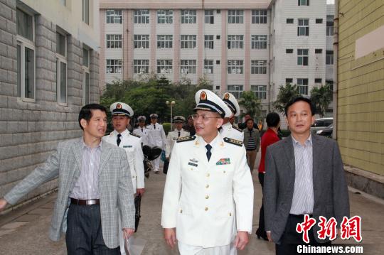 “玉林”舰官兵代表团长、南海舰队某驱逐舰支队政治部主任刘健忠看望母校发展情况。 李建红 摄