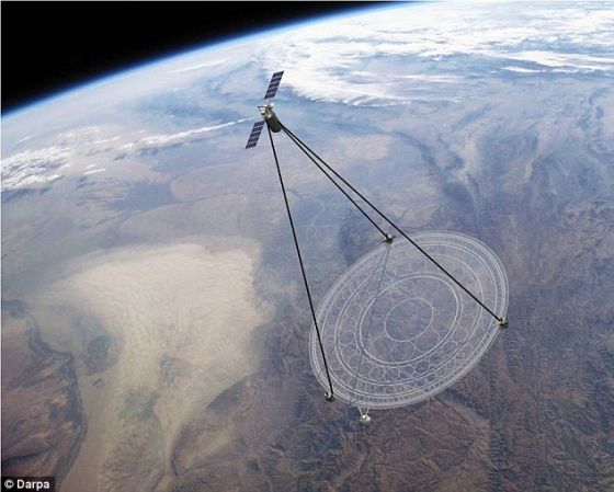 艺术概念图,展示了美国五角大楼研制的名为“薄膜型光学即时成像器”(MOIRE)的巨型间谍卫星。MOIRE卫星一次可覆盖40%的地表区域,能够在任何时间传输世界上任何地点的实时高清晰影像