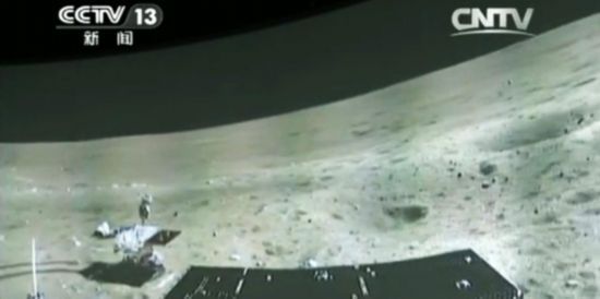12月20日消息,成功完成月面软着陆后,嫦娥三号目前已进入科学探测阶段。利用着陆器上地形地貌相机传回的图像,科研人员制作完成了首张着陆区全景照片。图为电视视频截图。