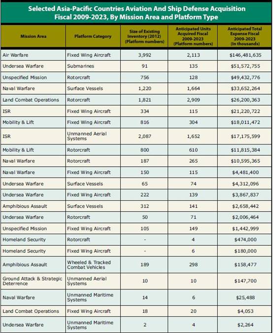 据分析,这些国家和地区已公布计划将投入3782亿美元用于航空与海军相关装备,是2009~2012财年的四倍。