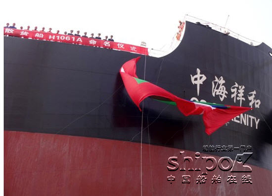 1月18日,由上海江南长兴重工有限责任公司为中海散货运输有限公司建造的首艘18万载重吨散货船“中海祥和”轮在上海举行命名仪式。