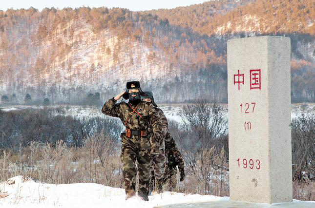 又是一个寒冷的早晨,迎着曙光,巡逻队又驶上了界河。望着远去的巡逻队,界河上留下的是一道道忠诚的辙印。(国防部网)