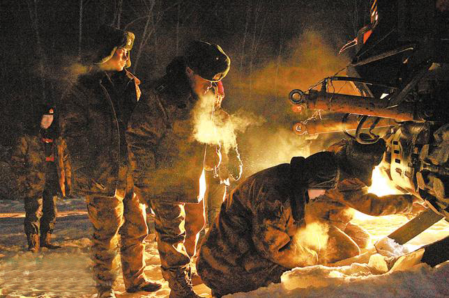 一路磕磕绊绊,出了不少情况,但与往年相比已经很顺利,还差40多公里就到伊木河边防连了。可没容官兵们松口气,大家最不愿看到的情况还是发生了:开道车撞上一处暗礁,破雪大铲结构件破裂,经过近两个小时的抢修无果,只得把破雪大铲由前边推变为后面拽。最终,巡逻队在凌晨1点多艰难抵达伊木河边防连。顾不上休息,队员们继续维修装备。