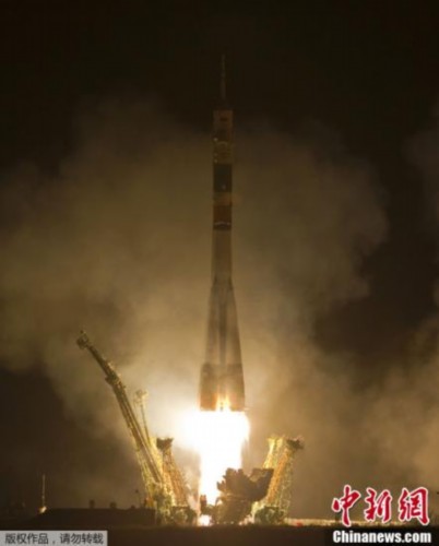 资料图:当地时间2013年3月29日零点43分,俄罗斯“联盟-FG”运载火箭携“联盟TMA-08M”载人飞船从哈萨克斯坦境内的拜科努尔航天发射场发射升空,把新一批3名宇航员送往国际空间站。