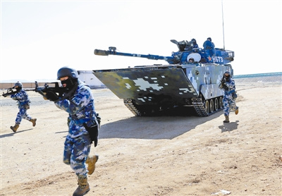 3月13日,正在北京军区某训练基地进行训练的海军陆战队某旅步兵在装甲车掩护下展开进攻。当日,该旅与北京军区某机步旅进行了一场城市攻防实兵对抗演练。