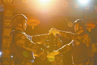 当地时间3月24日0时整,中国赴南苏丹瓦乌维和工兵分队进行防卫交接。巧合的是,代表新一批维和官兵交接的王一虎和代表上一批维和官兵交接的王笑平竟然是亲兄弟,两人来自河南省偃师市石牛村。哥哥王笑平2002年12月入伍到第20集团军某部,弟弟王一虎2003年12月入伍到第54集团军某部,两人均参加了本单位担负的维和任务。(解放军报)