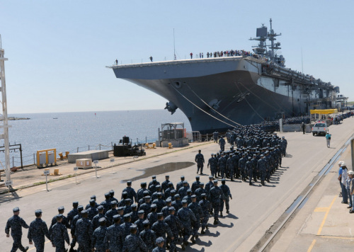 “美国”级两栖攻击舰长844英尺,宽106英尺,排水量44971长吨,舰员1204人(102名军官),海军陆战队队员1687名。(陈晓)