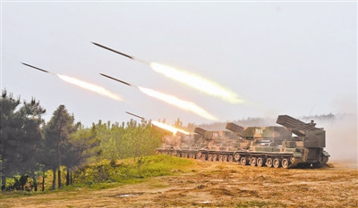4月27日,第1集团军某团组织部队进行实兵实弹战术演练,锤炼部队火力打击能力。图为火箭炮分队对“敌阵”进行火力覆盖。