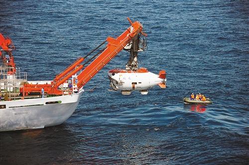 这是“蛟龙号”深海载人潜水器于2010年7月在中国南海执行一次成功下潜后出水。(资料照片)