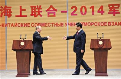 20日,上海吴淞海军军港,习近平与普京一起出席“海上联合-2014”中俄海上联合军事演习开始仪式。中新社记者 廖攀 摄