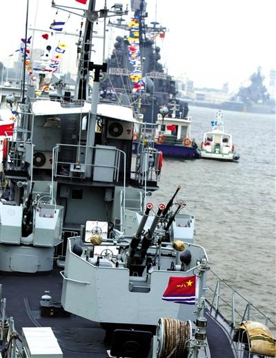 昨日下午,参加“海上联合-2014”军事演习的中俄舰艇离开上海军港,开往演习海域。中新社发