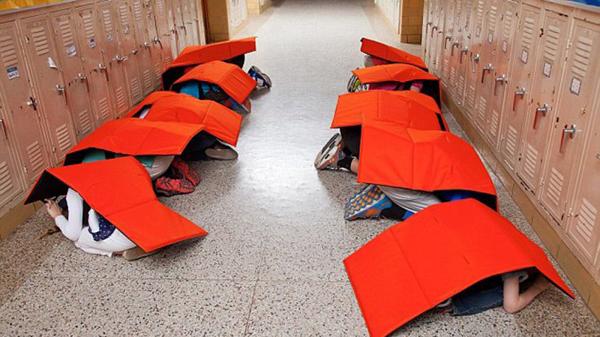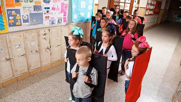美国小学生们演习枪战中穿戴防弹毯保护自身安全(网页截图)