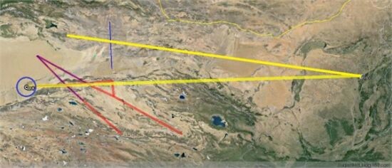 网友制作的两枚弹道导弹试射示意图。红线和蓝线分别是两组NOTAM关闭的航线,且末周围的蓝圈为禁飞区。两条黄线为推测的导弹飞行路线,射程分别约为2000 km和2250 km,推测都是高弹道飞行试验。