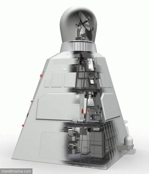 国外整体式桅杆剖视图,可看见各型天线与电子设备的布置情况。利用单向透波材料结合简洁的外形隐身设计可以大幅降低整个系统的雷达反射面积,从而增强战舰隐身性能。