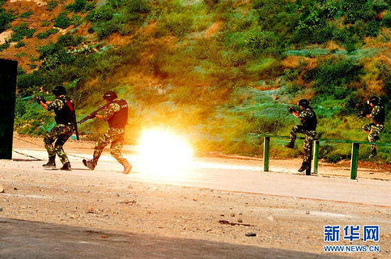 8月8日,训练基地机动中队特战队员演示实战过程中复杂地形环境下的突击战法运用。当日,新疆公安边防总队特战骨干实战技能比武竞赛活动在总队训练基地举行。来自伊犁、喀什、克州、阿勒泰、昌吉等全疆11个支队级单位的66名特战骨干参加此次竞赛。此次比武包括5公里武装越野、警务实战技能比武、手枪战术接力、对抗射击和5×100米接力5项比赛内容,检验了特战骨干综合素质和“一招制敌”能力。(新华网)