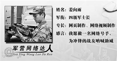 姜向雨本是一名炮兵侦察兵,曾代表团队参加师侦察兵比武,并获得第二名的好成绩,荣立个人三等功一次。同时,姜向雨热爱网络视频制作,参加军区“军营DV大赛”获得过第二名,因此被团政治处选为网络管理员。
