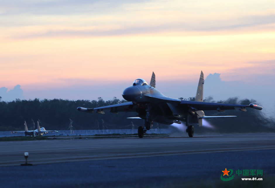 8月25日傍晚,在金色晚霞的映照下,广空航空兵某师多架战机相继起飞,奔赴指定空域开展跨昼夜实战化训练。连日来,该师紧贴使命任务,设置复杂战场环境,加强异型机和机群空战训练研究,加大对抗空战强度和难度,锤炼部队夜间遂行任务能力。通讯员张为栅摄影报道 图片来源:中国军网