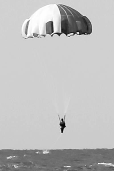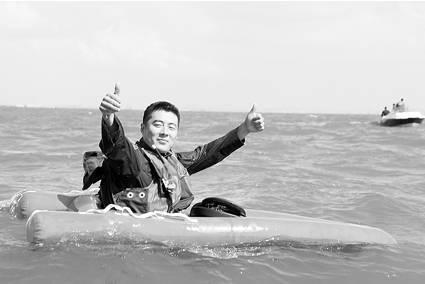“解开背带!”跳伞员在脚尖接水的那一瞬间,纵身一跃,脱伞,跳入水中,很快爬上救生船,发出了求救信号。冲锋舟快速机动至跳伞员的着水点,实施打捞。