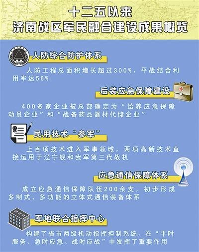 我军第三代战机成功在高速公路上起降、进行功能改造的亚洲最大客滚船首航成功、建成全国规模最大功能最全交通战备训练基地、率先建立光电夜视等5类战区级动员中心……近年来,济南战区凝聚军民融合深度发展共识,树牢“一盘棋”的建设理念,在“融”字上做文章,在“深”字上下工夫,进一步健全体系、理顺机制、完善法规,积极推进军民融合深度发展,取得了一系列成果。近日,本报记者对他们的实践与探索进行了调查。