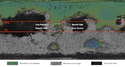经过对8个提议着陆点的仔细考虑,来自欧洲、俄罗斯和美国的科学家团队最终在火星赤道附近选出了4个候选着陆点。这4个着陆点分别是:马沃斯谷(Mawrth Vallis)、(奥克下平原)Oxia Planum、(海帕尼斯谷)Hypanis Vallis和(阿兰姆环形山)Aram Dorsum,在2017年10月将会为ESA的ExoMars火星巡视探测器选出单一的首选目的地。