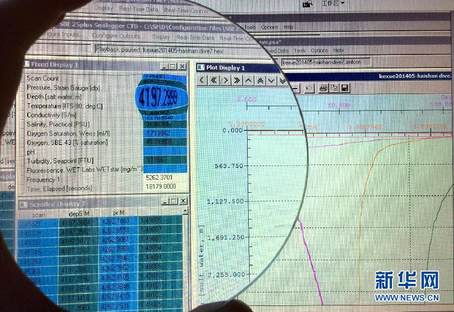 仪器数据显示“发现”号ROV深海机器人探测深度达到4197米(12月23日摄)。(赵琬微 摄)