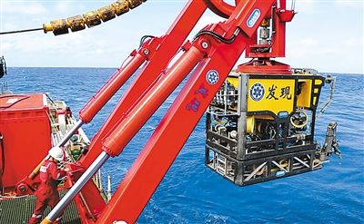 12月23日,正在西太平洋进行科学考察活动的“科学”号科考船上搭载的“发现”号ROV深海机器人(水下缆控潜水器)下潜至雅浦海山海域接近4200米深处,挑战设计极限。图为正被放入水中的机器人。(赵琬微 人民网-人民日报海外版)