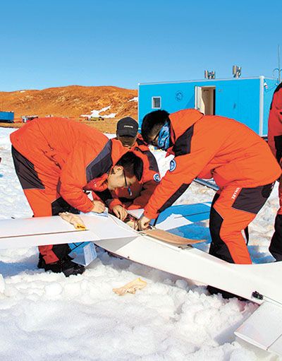 当地时间12月23日,“极鹰一号”小型遥感无人机在距南极中山站10公里处成功起飞,一小时后携带500余张高清遥感照片着陆,这是我国首次在南极地区使用无人机进行遥感测绘作业。图为科考队员在调试无人机。(白阳 人民网-人民日报)