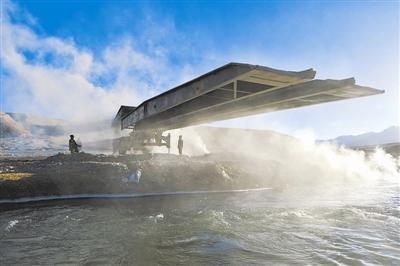 12月18日,驻藏某旅官兵在海拔4500米的雪域高原进行架桥训练。连日来,这个旅组织开展冬季野外驻训,将部队拉到生疏地域演练了一系列实战化课目,磨砺官兵意志,培育战斗精神。(张震 解放军报)