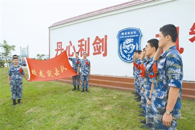 该团推迟退伍的12名老兵向蛟龙突击队队徽和队旗告别。孙宏韬 摄