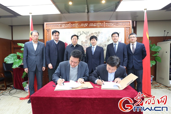 中国科技馆网络科普部主任王京春与光明网副总经理宋乐永分别代表双方签约(光明网记者 孙佳涵/摄)