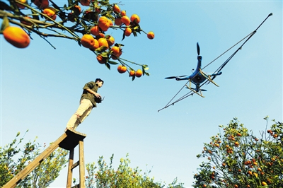 元旦期间,广西永福县出资200多万元,对县里三大农产业之一、约20万亩的富硒砂糖橘进行无人飞机喷药灭虫。在广西永福县百寿镇,技术人员利用无人飞机喷农药。(刘教清 科技日报)
