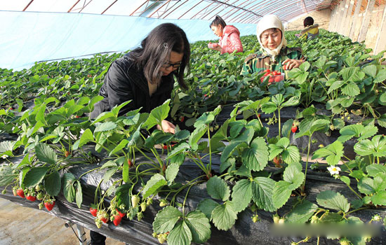 1月29日,新疆哈密市恒顺特色农业种植基地几位工作人员在采摘草莓。