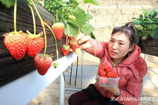 近日,新疆哈密市恒顺特色农业种植基地引进的韩国高架草莓陆续成熟上市。该园区引进韩国高架草莓无土栽培技术,以椰树壳为种植原料,采用蜜蜂授粉、生物有机肥和配方施肥等无公害生产技术,草莓产量是普通种植草莓的三倍,成为当地农业增收新亮点。