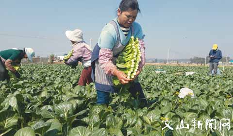 松南农业开发有限公司是一家致力于精细蔬菜种植、销售以及新技术、新品种引进推广的新兴科技型企业,是云南省农业产业化经营的重点龙头企业,下属4个公司,即昆明呈贡松南经贸有限公司、玉溪松南绿色产品有限公司、砚山县松南农业开发有限公司、六诏松南蔬菜种植有限公司,其中有两个公司在砚山县境内。2009年3月,在当地党委政府的大力支持下,砚山松南开发有限公司从农民手中租用了980余亩土地,10月份开始种菜。一个月后,公司基地生产的第一拨蔬菜运往深圳。6年时间过去了,蔬菜基地日渐发展壮大,种植面积已增加到了3000余亩。去年底,公司又到平远镇租了1000多亩土地。蔬菜基地每天都有500个固定工人上班。5到11月,是蔬菜上市的高峰期,基地每天要发运近50吨蔬菜到深圳。据基地负责人朱宏辉介绍:每天天亮前,就把头一天收割的蔬菜从冷库里搬出来装车运走。