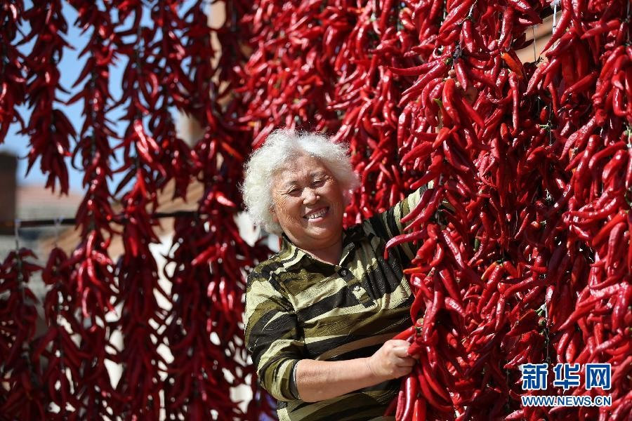 9月14日,吉林省吉林市龙潭区乌拉街镇阿拉底朝鲜族村村民在晾晒收获的红辣椒