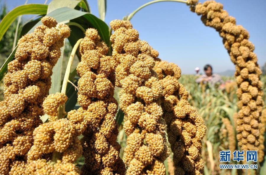 9月13日,山东省沂源县东里镇王坪村的农民在收获谷子