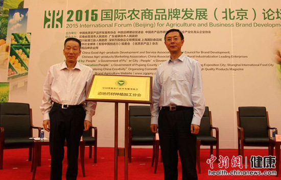 9月20日上午,在2015国际农商品牌发展(北京)论坛由农业部农产品质量安全控制中心主任、中国优质农产品开发服务协会常务副会长刘新录和道地中药材种植加工分会会长万跃宁为中国优质农产品开发服务协会道地中药材种植加工分会成立揭牌。(中新网健康频道)