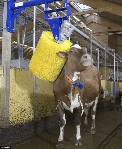 瑞典一家农业机械制造公司发明了一部专门为奶牛洗浴、擦身的机器,经常用这台机器洗澡的奶牛产奶量会得到大幅度的提升。