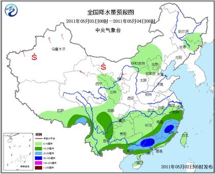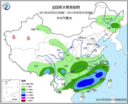 5月2日08时至3日08时,江南中南部、华南中北部以及四川盆地西南部、西藏东南部等地的部分地区有大雨或暴雨,华南北部局地有大暴雨;上述部分地区并伴有短时雷雨大风冰雹等强对流天气;内蒙古中东部、华北大部、东北大部、黄淮东部等地有4~6级风;新疆南疆盆地的部分地区有扬沙或浮尘天气。东海的部分海域有5~6级风。