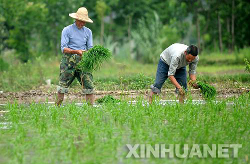 6月20日,遭受洪灾的江西德兴市皈大乡定坑村农民抓紧时机补栽秧苗,弥补损失。