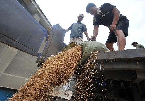 6月22日,在安徽省蚌埠市粮食局第三仓库收购点,农民在倾倒销售的小麦。